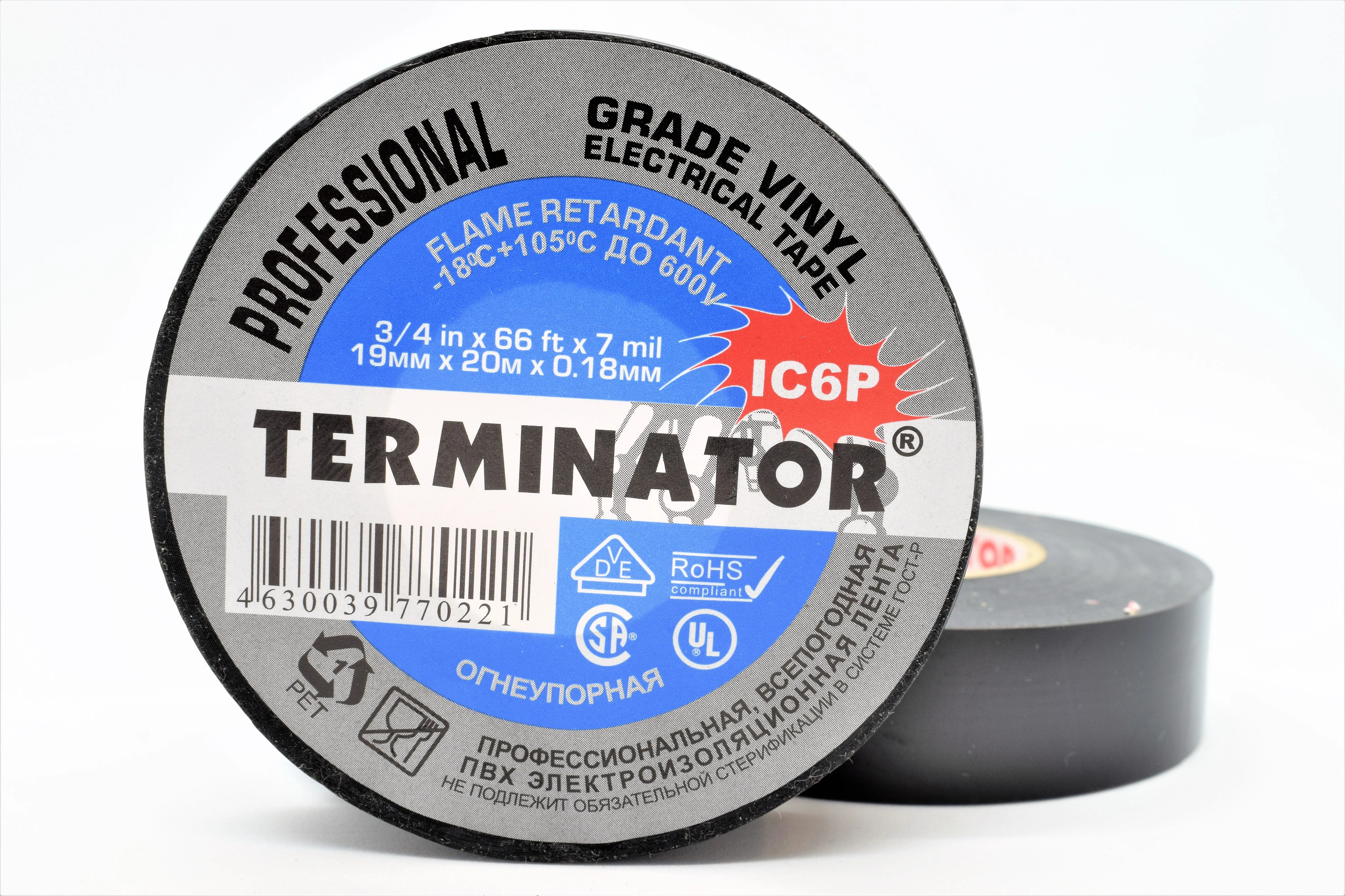 Изолента ПВХ Terminator IC6P 19мм*20м, толщина 0,18мм огнеупорная, всепогодная чёрная (упак.10/200шт.)
