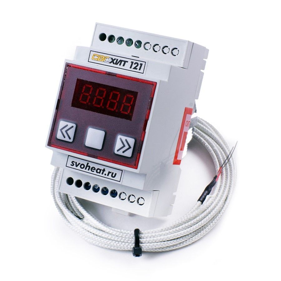 Цифровой терморегулятор Свохит-Метео 121 в компактном корпусе размером 3 стандартных модуля DIN. Прибор позволяет контролировать температуру в реальном времени и управлять нагревательными приборами путем включения-отключения нагрузки. Терморегулятор Свохит-Метео 121, в зависимости от используемого термодатчика, способен измерять температуры от −200°C до +1100°C (с датчиком ТХА).