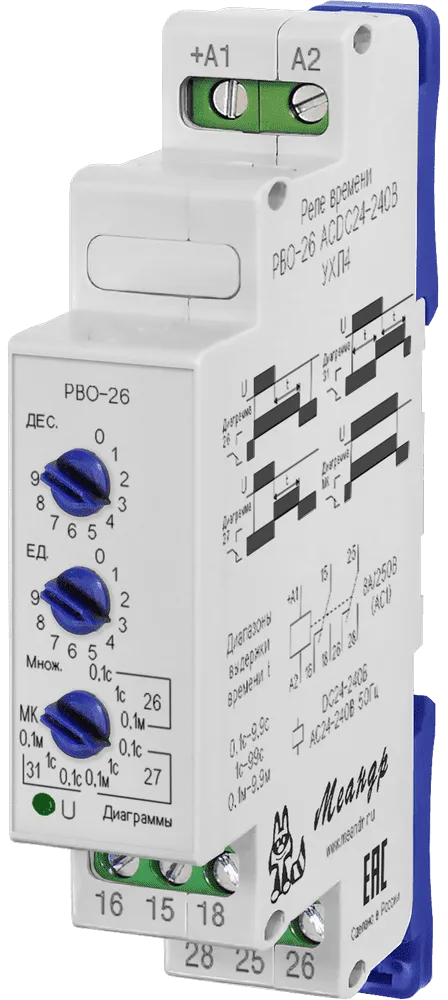Реле времени РВО-26 предназначено для формирования задержки на выключение исполнительного реле после снятия напряжения питания (диаграмма работы 26 и 31) или для включения исполнительного реле после снятия напряжения питания (диаграмма работы 27) на предварительно установленную выдержку времени. Реле обеспечивает работу встроенной контактной группы без выдержки времени (диаграмма работы МК).