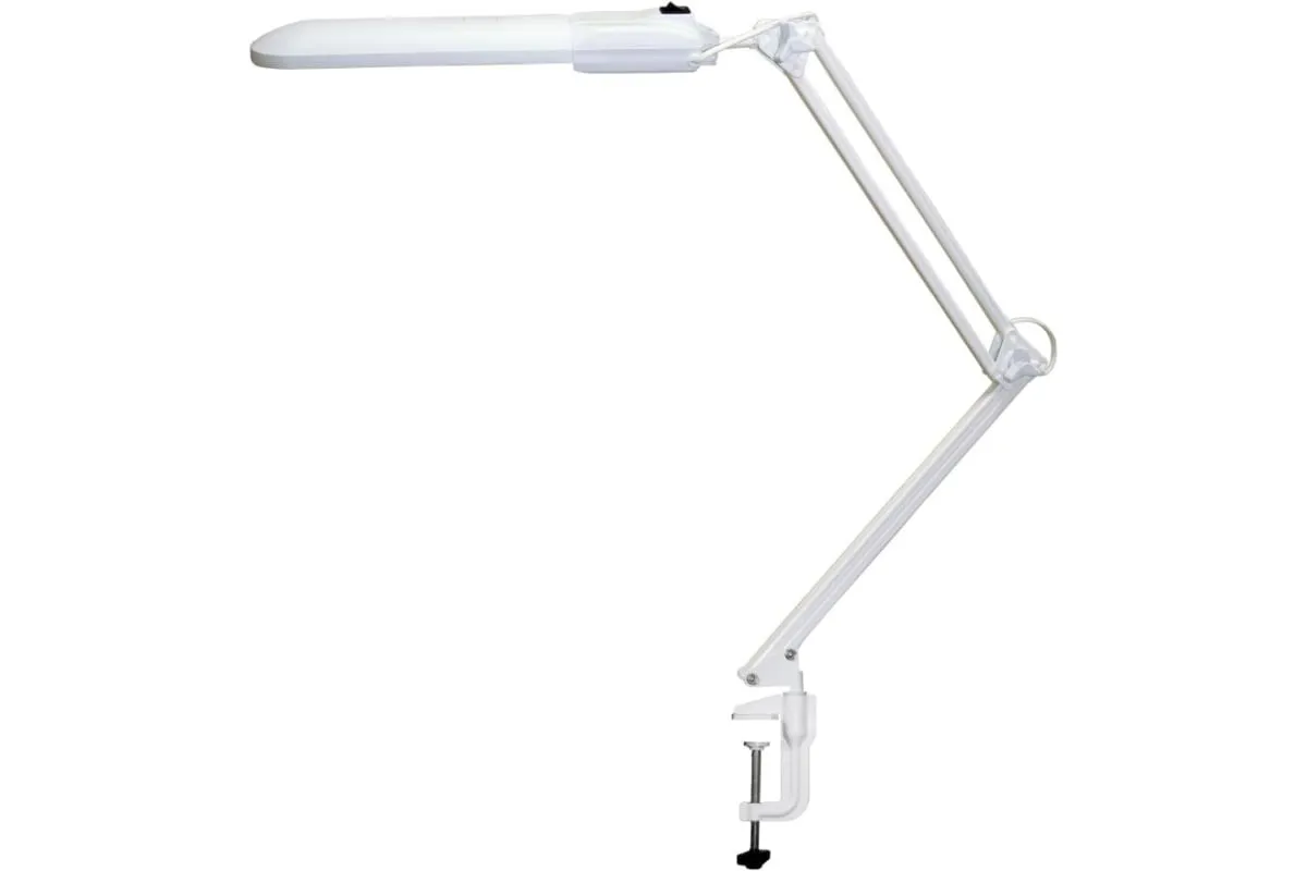 Светильник Дельта белого цвета на металлической струбцине. Применяется в офисных, жилых помещениях, учебных заведениях для работы на компьютере, чтении или письменных работах.